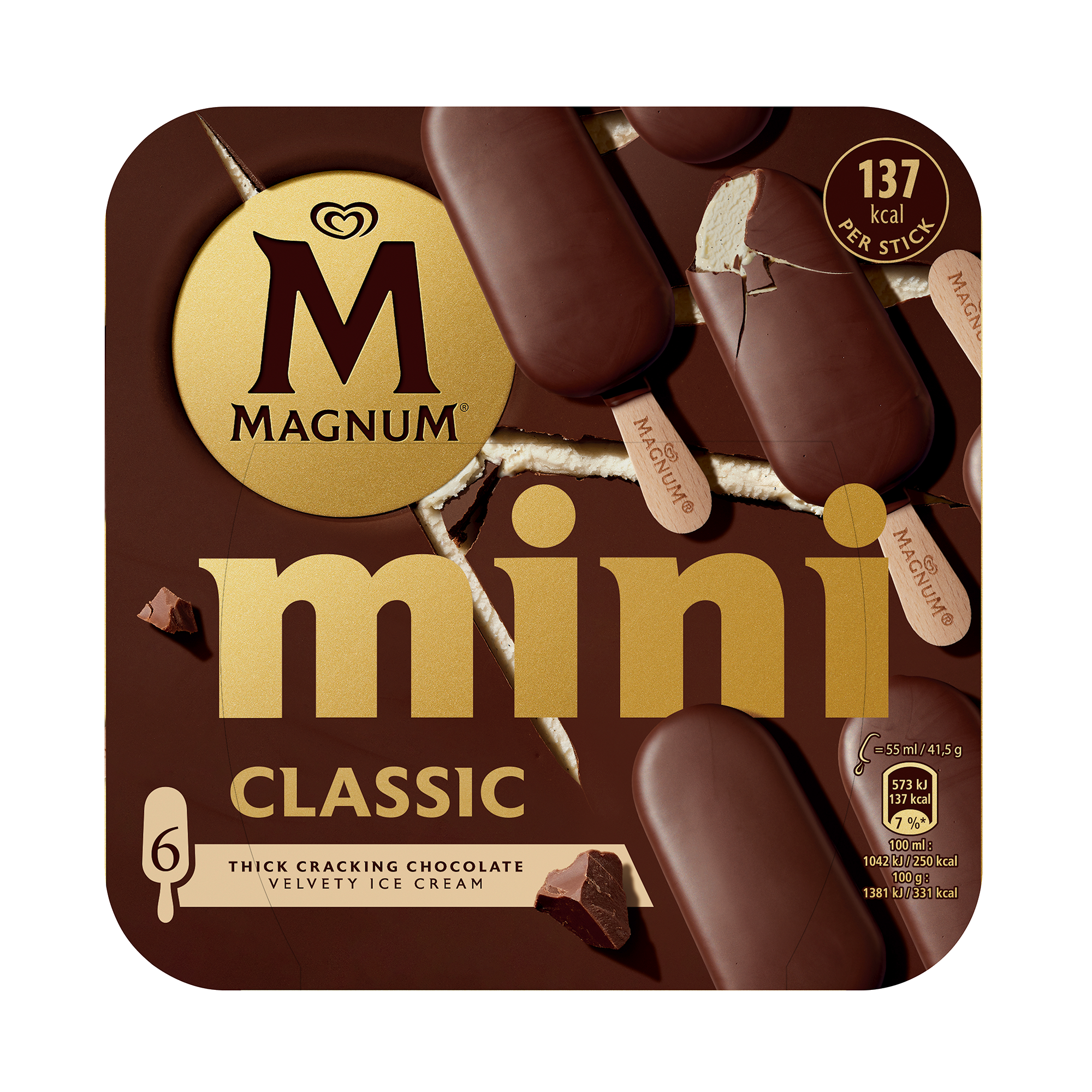 Sammetslen vaniljglass insvept i ett lyxigt lager av Magnums knäckande choklad. Detta flerpack innehåller 6 Magnum Classic mini glasspinnar.