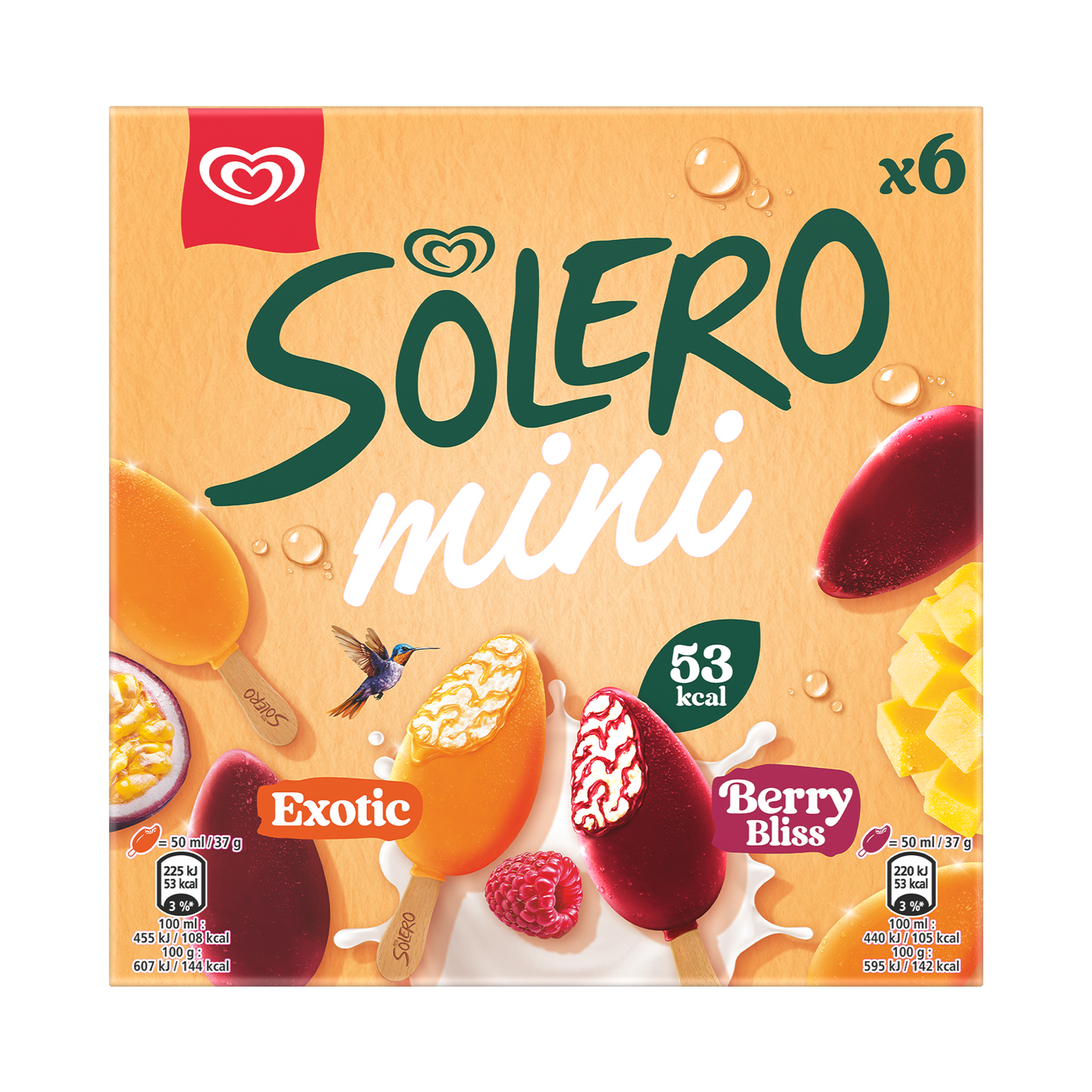 Mixade favoriter från Solero nu i miniformat! Nu finns både den klassiska och populära Exotic och den nya Berry Bliss i ett praktiskt flerpack av Solero i miniformat. Solero kombinerar len vaniljglass med en fruktvirvel och ett överdrag av sorbet gjord på exotiska frukter och bär. Denna glass är skapad för alla fruktälskare och ger dig den perfekta kombinationen av glass och frukt i ett och samma bett.